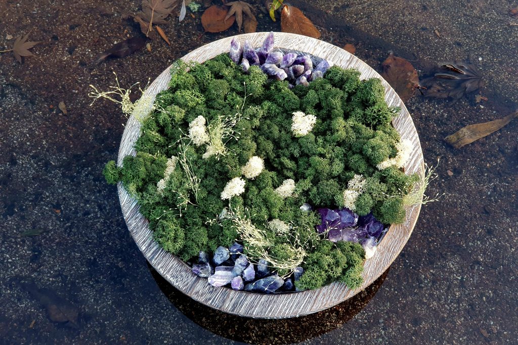 Material: Konserviertes Islandmoos und Gräser, Amethyst Rahmen: rund, Durchmesser: ca. 30 cm Aufhängung: inklusive vormontierter Aufhängung Preis: 175 € (inkl.
