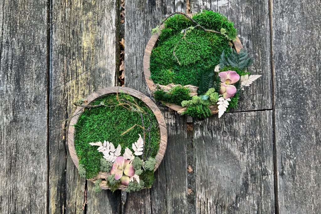 Material: Konserviertes Island-, Kugel- und Flächenmoos, Baumrinde, Kunstsukkulente Rahmen: rund, Durchmesser: ca. 50 cm Aufhängung: inklusive vormontierter Aufhängung Preis: 350