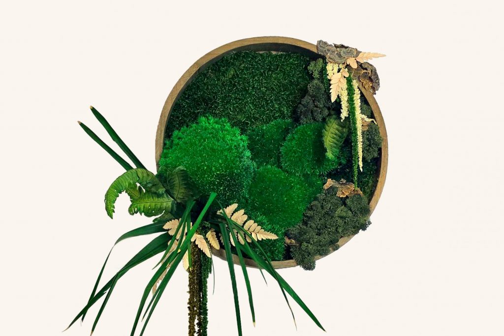 Material: Konserviertes Island-, Kugel- und Flächenmoos, Farne, Baumrinde, Amaranth und Kunstpflanze „Tillandsia“ Rahmen: rund, Durchmesser: ca. 50 cm Aufhängung: inklusive