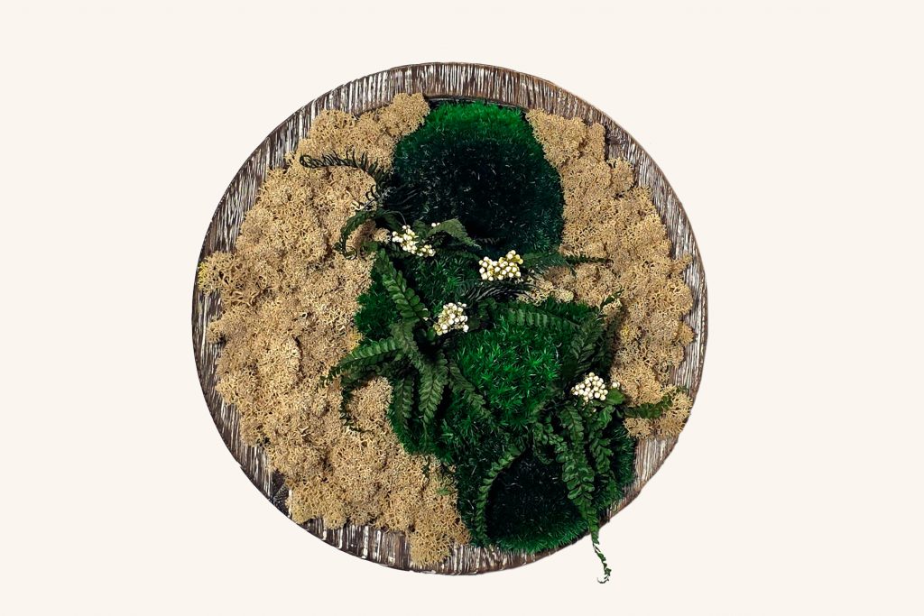 Material: Konserviertes Island- und Flächenmoos, Farne, Amaranth, Baumrinde, Zweige und eine Kunstpflanze Rahmen: rund, Durchmesser: ca. 30 cm Aufhängung: inklusive